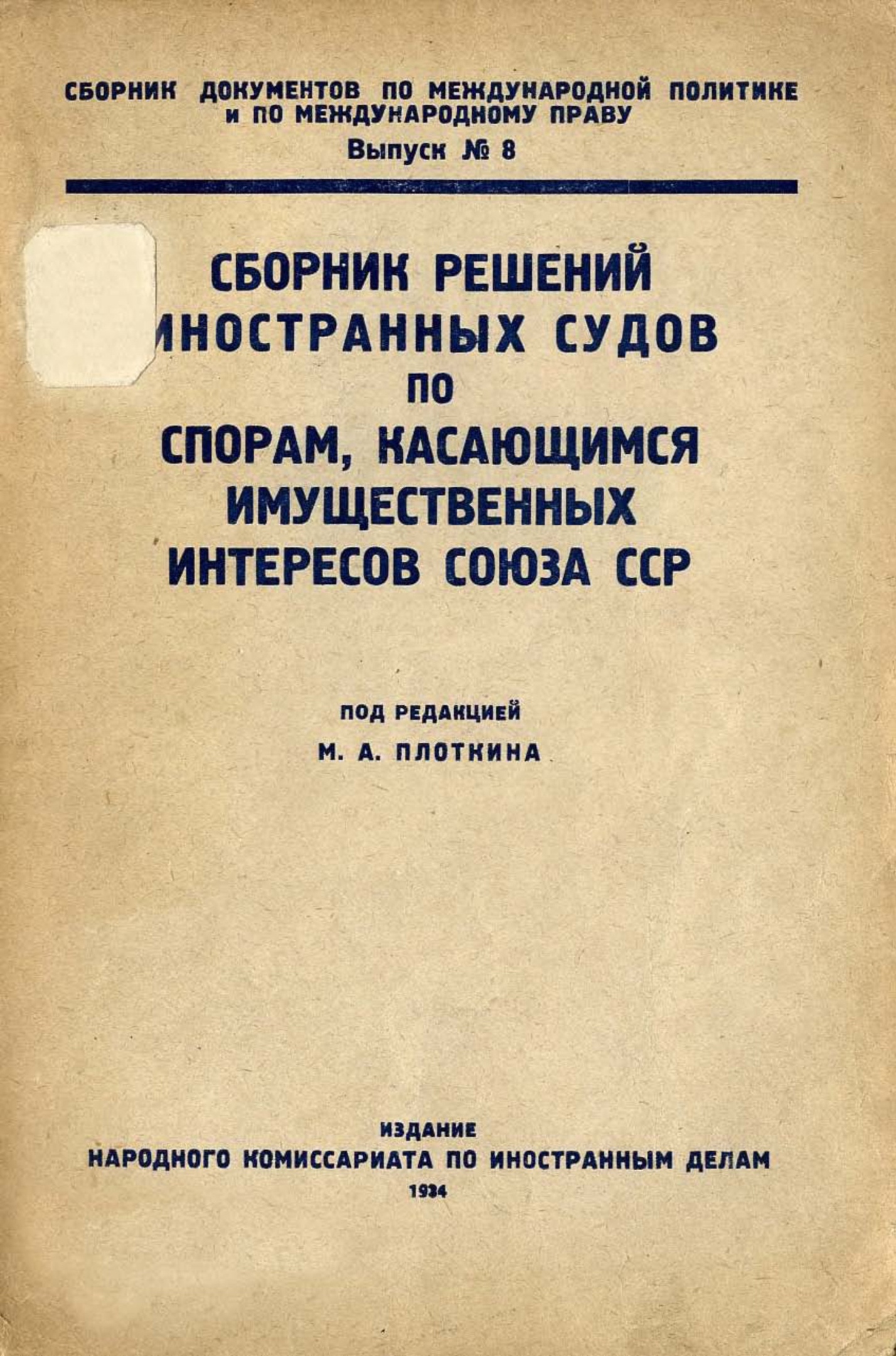 Выпуск 8: Сборник решений иностранных судов по спорам, касающимся имущественных интересов Союза ССР / Под редакцией М.А. Плоткина. М.: Издание Народного Комиссариата по Иностранным Делам, 1934. 115 с. Тираж 1000 экз.